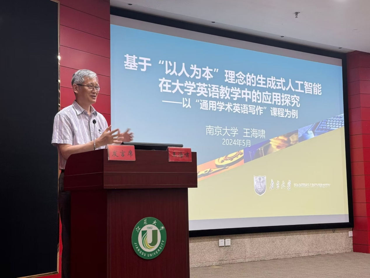 On May 31st, Professor Wang Haixiao, Chairman of Jiangsu Collegiate Foreign Language Teaching and Research Association visited School of Foreign Languages at the invitation of the Teaching Development and Quality Assessment Center to conduct a lecture entitled ’Application of People-oriented Generative AI in College English Teaching’. The lecture was presided by Professor Chen Xin, Director of the Teaching Development and Quality Assessment Center.