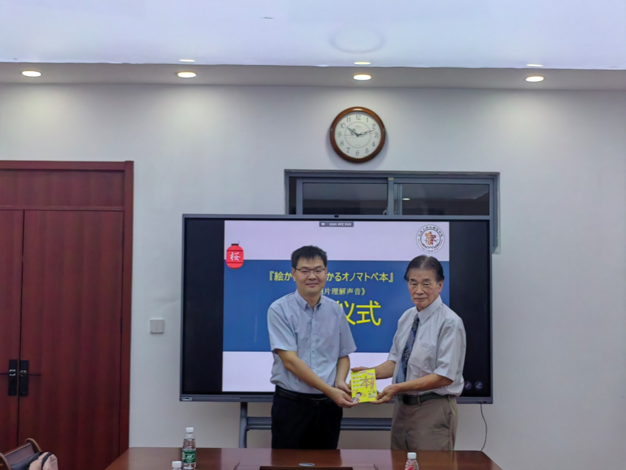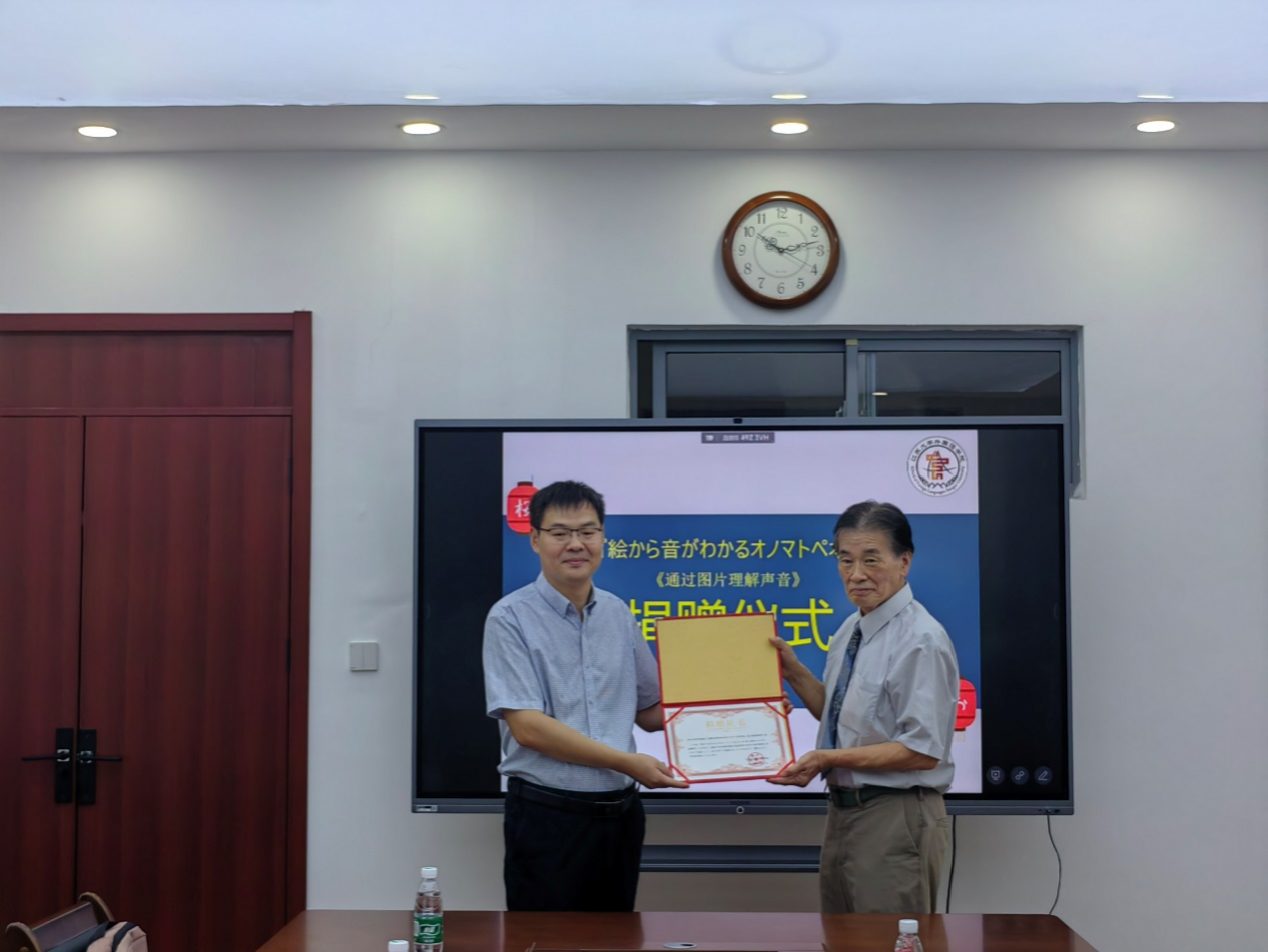 Mr. Masao Hara, the Deputy Director of Japan Future International Exchange Group (a Non-Profit Organization, NPO), visited the School of Foreign Languages and donated 50 copies of Understanding Sounds through Pictures to support the cultivation of Japanese major students on the morning of August 13.