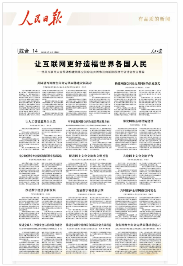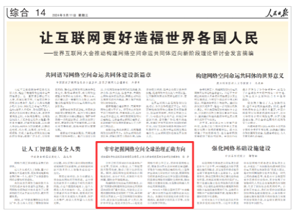 On September 3rd, the theoretical seminar on "Advancing the Building of a Cyberspace Community with a Shared Future for Mankind towards a New Stage" was held in Beijing as a part of the World Internet Conference . Zhuang Rongwen, Director of the China Internet Information Office and Chairman of the World Internet Conference, Wang Song, Deputy Director of the China Internet Information Office, Ren Xianliang, Secretary-General of the World Internet Conference, and other officials attended the event. Keynote speeches were invited from Wu Hequan, academician of the Chinese Academy of Engineering; David Gosset, founder of the Sino-European-American Global Initiative; Ke Ruiwen, Chairman of China Telecom; Wu Jianping, academician of the Chinese Academy of Engineering and Director of the Zhongguancun Laboratory; Li Junru, former Vice President of the Party School of the Central Committee of the CPC; Jeong Gi-man, Honorary Professor of the Korea Advanced Institute of Science and Technology and the "Father of the Korean Internet"; David Ferguson, Honorary English Editor-in-Chief of the Foreign Languages Press of China International Publishing Group; and Mark Lin, Fellow of the Australian Academy of the Humanities, among others. On September 11, People's Daily published excerpts from the participants' speeches at the theoretical seminar of the World Internet Conference. Xu Bu, Chairman of the Global Development and Security Institute at Jiangsu University,delivered the following remarks: