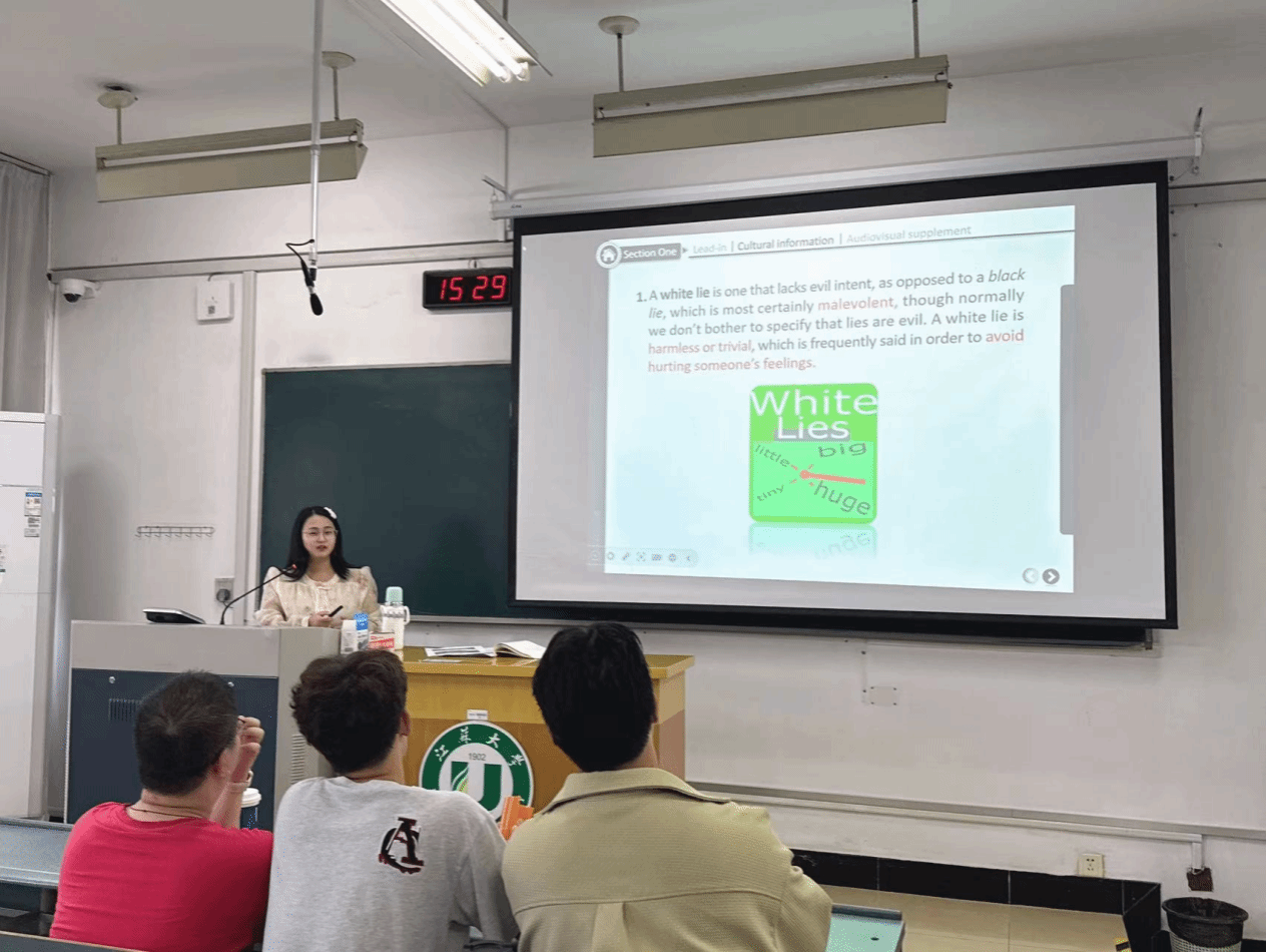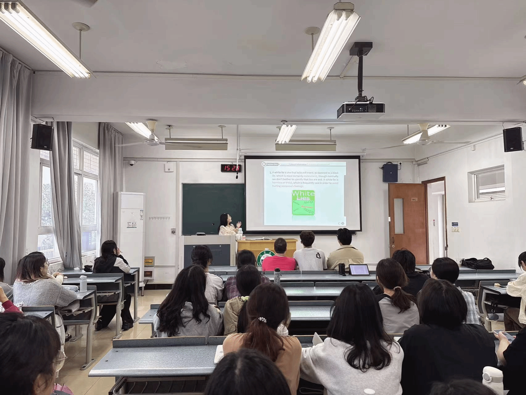 On 14th and 16th October, Dr.Hou Lusha from English Department of the School of Foreign Languages held two unique open classes in class rooms 215 and 208 of Sanshan Building respectively, in which she used the unit of ‘The Truth of Lies’ in Comprehensive English A(III) as the content of the public lectures. In the introductory section, Dr. Hou introduced the unit theme with two short videos-“Folk Songs about White Lies” and “The Negative Effects of White Lies” -to attract students' attention and stimulate their curiosity about lies and the truth behind them.