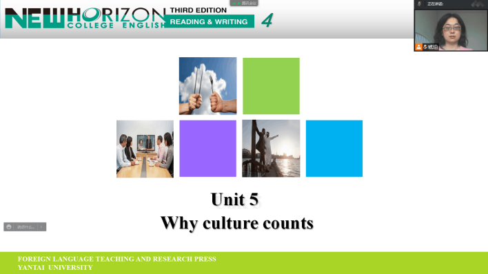 During the lecture Ms Ni actively expounded strategies to integrate the ideological and political elements into English teaching. The content of her lecture was based on Unit 5 of New Horizons College English (4 ).