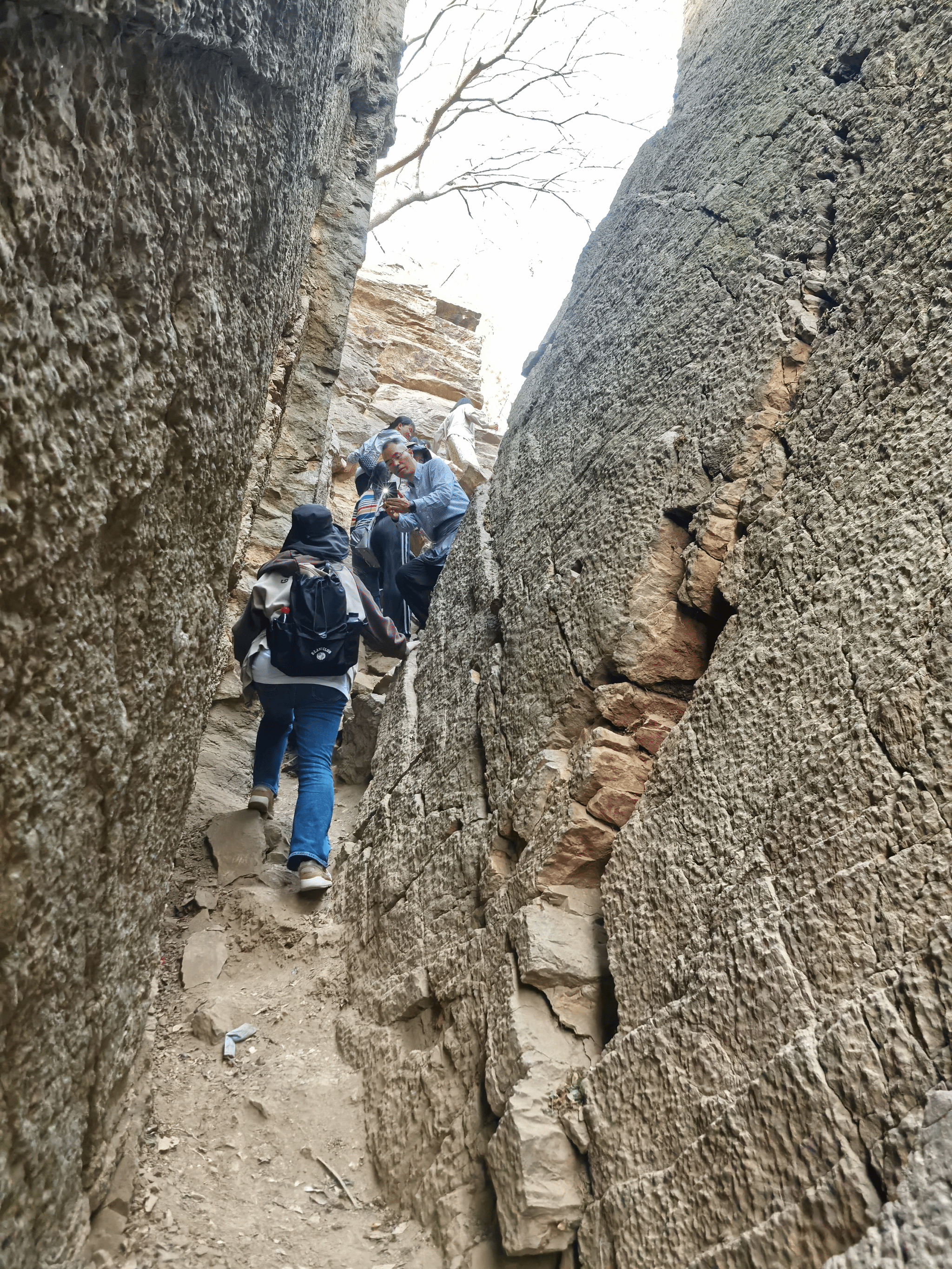 南山大裂谷位于镇江高崇寺附近,是一处充满野趣的小众秘境。教职工们从高崇寺出发,沿着登山入口的陡坡攀爬,途中虽有树枝和落脚点,但仍需手脚并用。经过约10分钟攀登,大家登顶后看到壮观的“一线天”,两侧巨石高耸,中间仅留窄缝,令人惊叹。继续前行,通道狭窄崎岖,尽头还需攀爬才能前进。下山路线陡峭但有绳子辅助,安全抵达山下后,大家来到日月潭观景台,远眺青山青潭,感受山风,疲惫尽消,纷纷拍照打卡。