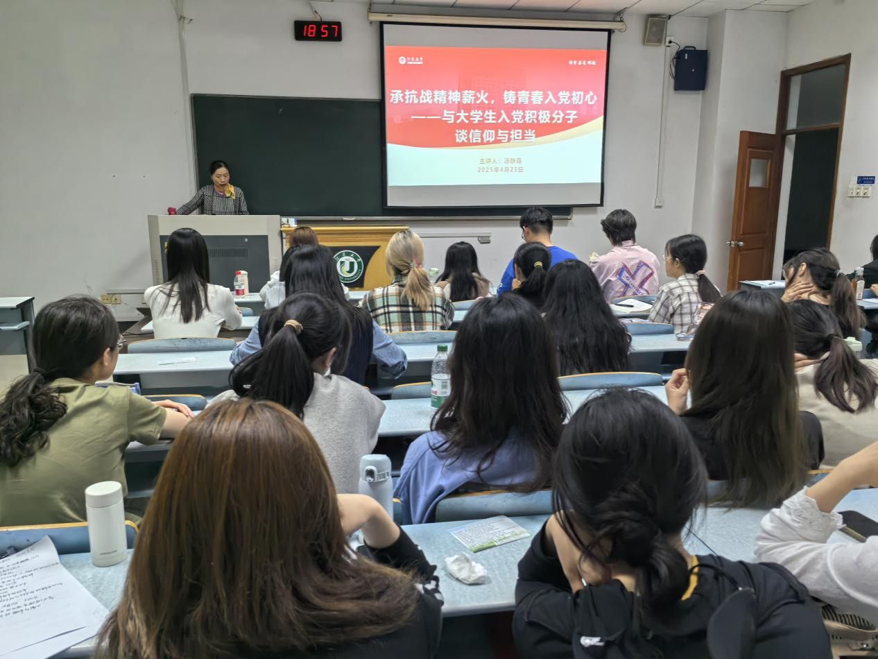 4月23日,校关工委副主任汤静霞应邀在三江楼402教室作题为“承抗战精神薪火,铸青春入党初心——与大学生入党积极分子谈信仰与担当”的专题讲座,外国语学院全体入党积极分子参加了此次讲座。