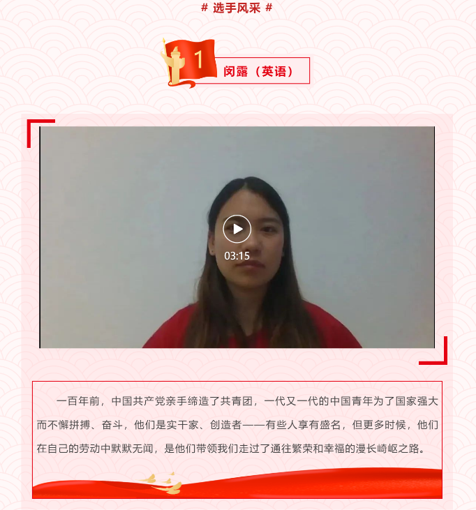 本次比赛紧紧围绕“我眼中的中国青年”,旨在用外语向世界展现中国青年的智慧、力量、担当。同学们通过演讲,生动展现了党领导中国青年运动的光辉历程和重大成就,生动展现了新时代青年跟党奋进新征程、青春建功新时代的新生和行动。本次活动收到英语、日语、朝鲜语等语种的20余份作品,经过学院评选,优秀作品通过微信公众号“yl7703永利集团”进行展播。